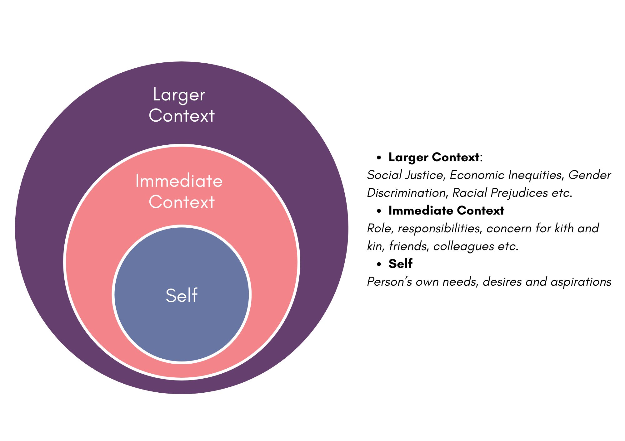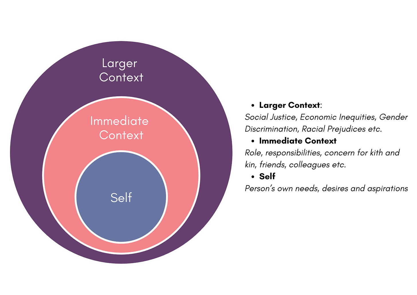 One can look at human engagement in three concentric circles. The innermost circle pertains to the person’s own needs, desires and aspirations. The middle circle focuses on engagement with the immediate context- role responsibilities, concern for kith and kin, friends, colleagues etc. The outer circle focuses on issues of the larger context- social justice, economic inequities, gender discrimination, racial prejudices etc.
